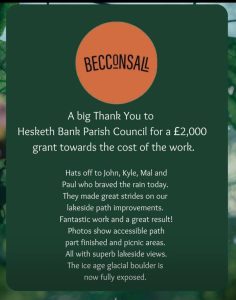 Hesketh Bank Parish Council kindly gave a grant of £2000.00 towards the cost of work improving part of our lake path and picnic area.